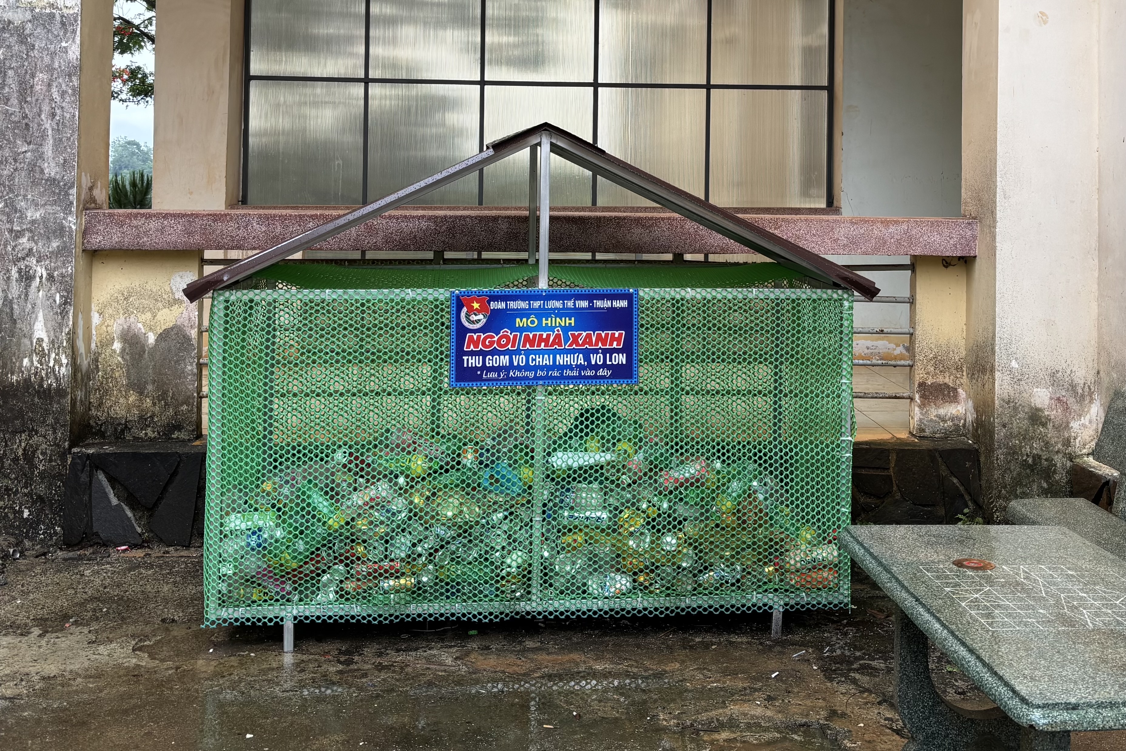 “Ngôi nhà xanh” là mô hình thu gom rác thải tái chế, cụ thể là vỏ lon và chai nhựa, được thiết kế dưới dạng các thùng chứa mô phỏng hình ngôi nhà. Hiện tại, trường đang có 3 ngôi nhà xanh được đặt ở 3 vị trí hợp lý, có khoảng cách phù hợp, thuận tiện cho việc vứt bỏ lon, chai. Với hình thức trực quan, dễ nhận biết, mô hình đã thu hút sự quan tâm và tham gia tích cực của đông đảo đoàn viên, học sinh. Qua đó, từng bước hình thành thói quen phân loại rác tại nguồn, nâng cao ý thức giữ gìn vệ sinh môi trường trong học đường.